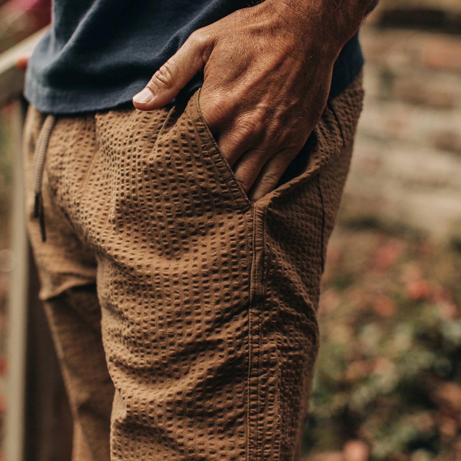 The Après Pant in British Khaki Seersucker from Taylor Stitch.