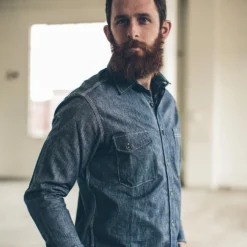 Constructed from salt & pepper cotton chambray, it’s got the bones of your grandfather’s burly work shirt, but with a modern tailored finish. Limited in Indigo.